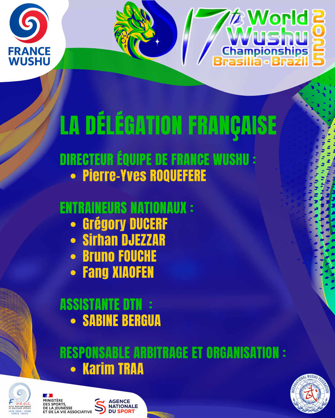 Les sportifs seront encadrés par un staff technique expérimenté : le DTN, Directeur équipe de France Wushu : Pierre-Yves ROQUEFERE; les entraîneurs nationaux : Grégory DUCERF, Sirhan DJEZZAR, Bruno FOUCHE, Fang XIAOFEN ; l’assistante DTN : Sabine BERGUA ; et le responsable arbitrage et organisation : Karim TRAA.