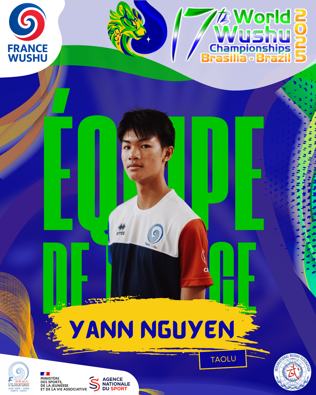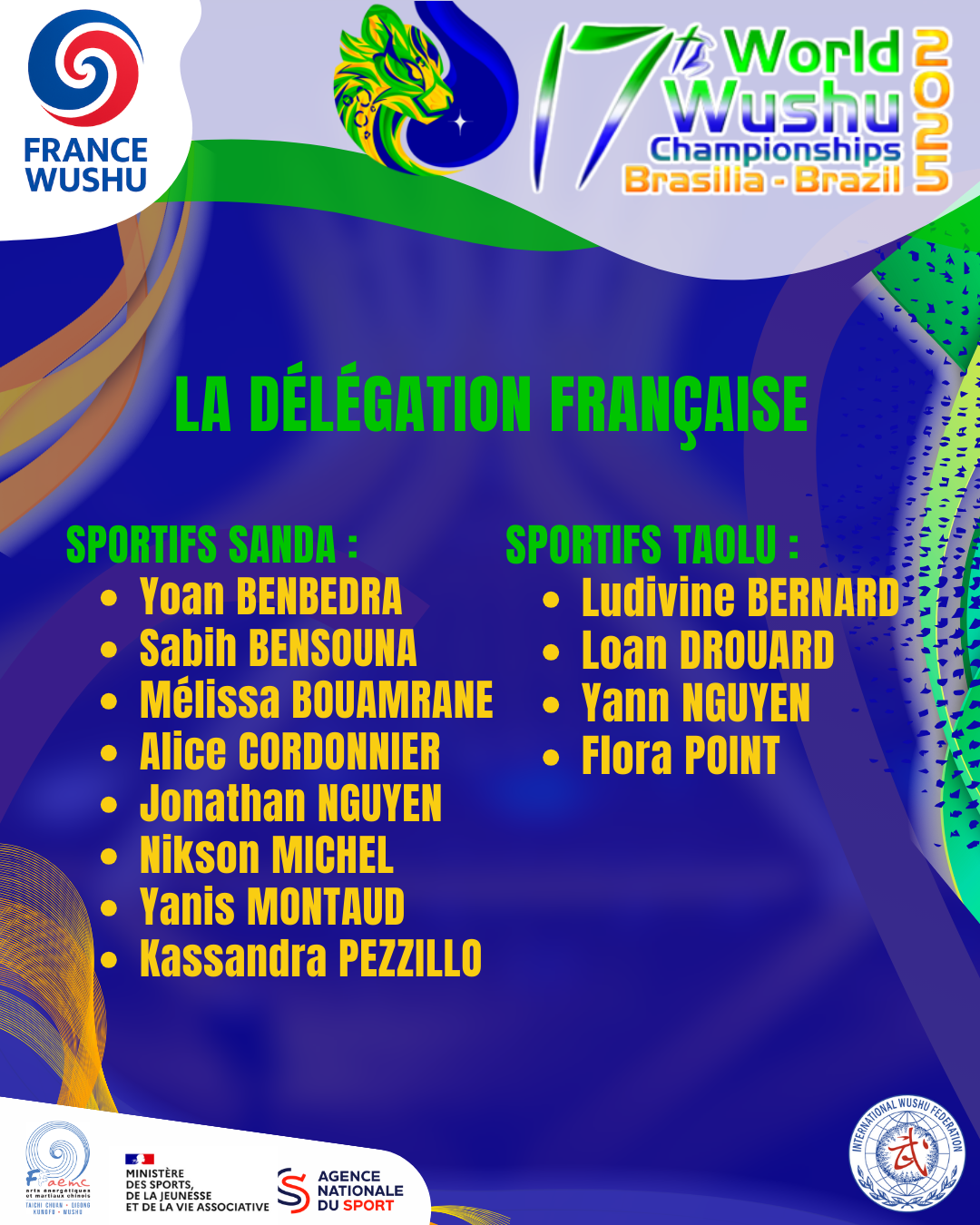 La FFAEMC a l’honneur d’annoncer la sélection des sportifs qui représenteront la France aux 17e championnat du monde de Wushu du 31 août au 7 septembre 2025 à Brasilia, au Brésil.